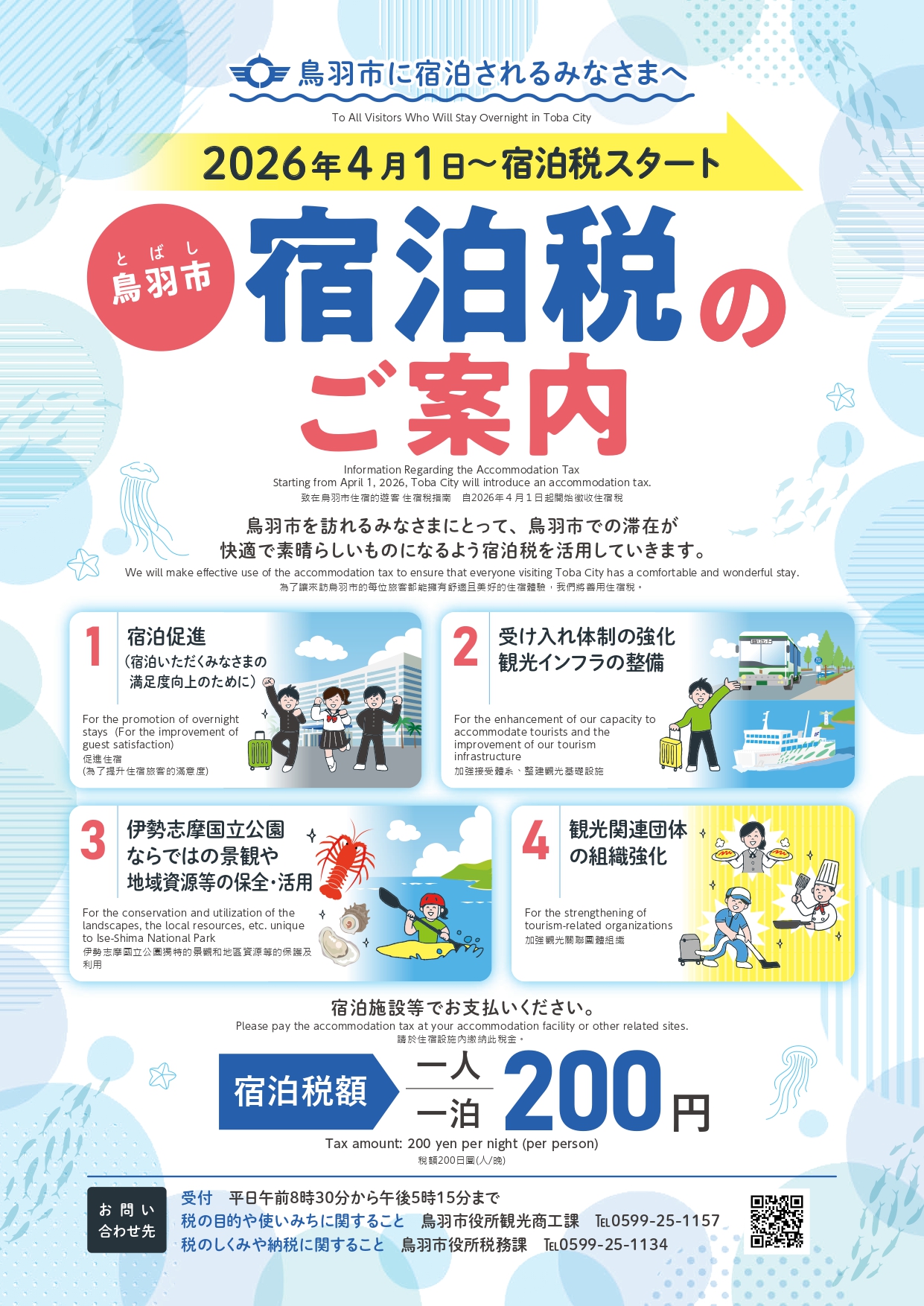 鳥羽市では、観光資源の魅力向上や旅行者の受け入れ環境整備その他観光振興を図るための持続可能な財源確保の手段として、法定外目的税である「宿泊税」を導入することとなりました。令和7年3月に鳥羽市宿泊税条例を制定し、令和8年4月施行を予定しています